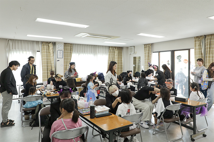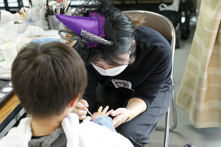 毎年大人気のフェイスペイントブース。昨年に引き続き、ECCアーティスト美容専門学校ヘアメイクアーティストコースの学生が担当しました。総勢11名で50名の子どもたちを施術。学生たちはペイント技術に加え、コミュニケーションでも子どもたちを楽しませ、ハロウィンムードをさらに盛り上げていました。