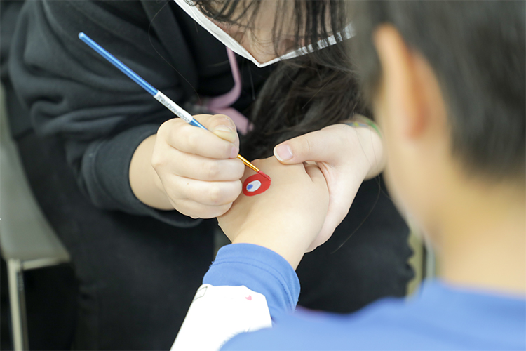 - 学外の方に施術するのも、子どもに施術するのも今回が初めてでした。小さいお子さんは長時間じっとしているのが難しいので、動きが止まった瞬間に急いで描くなど工夫しながら進めました。今後は施術面もコミュニケーション面も、一人ひとりにあわせて臨機応変に対応できるようスキルを磨いていきたいです!(木村さん)