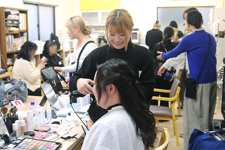 アイシャドウやチークなど、利用者さんの好みに耳を傾ける学生たち。さらには、季節感を意識した提案も。