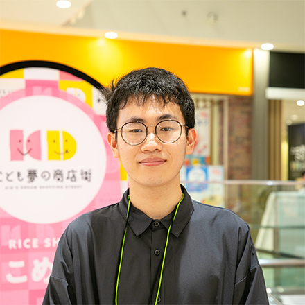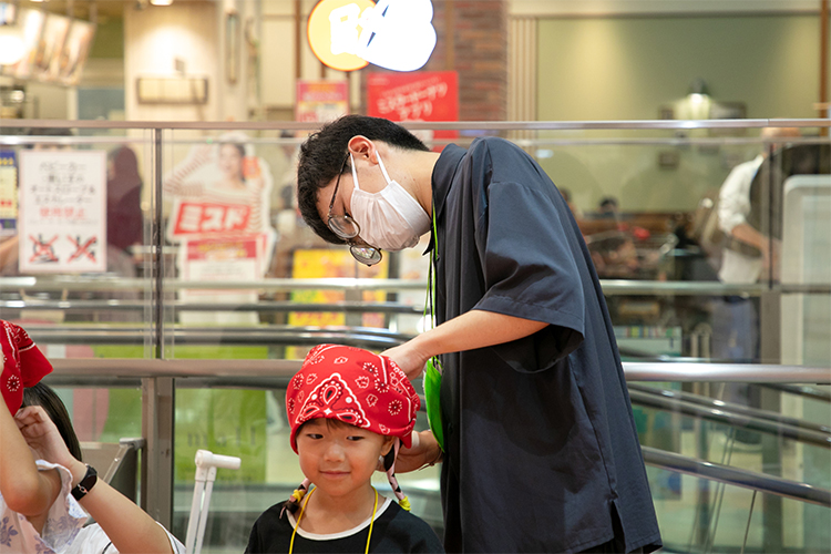 「こども夢の商店街」は、小学生を中心としたこどもたちが仕事体験を通して”働く楽しさ”を学ぶ教育イベント。こどもたちは銀行、警察、放送局などさまざまなオシゴトに取り組み、お給料の「おむすび通貨」を受け取ります。お給料を使って「お店屋さん」でお買い物を楽しむことも。そんな実践的な学びの現場で、こどもたちをサポートするのが「こどもサポーター」です。山口学園からは、ECCコンピュータ専門学校1年の長原さんが参加しました。