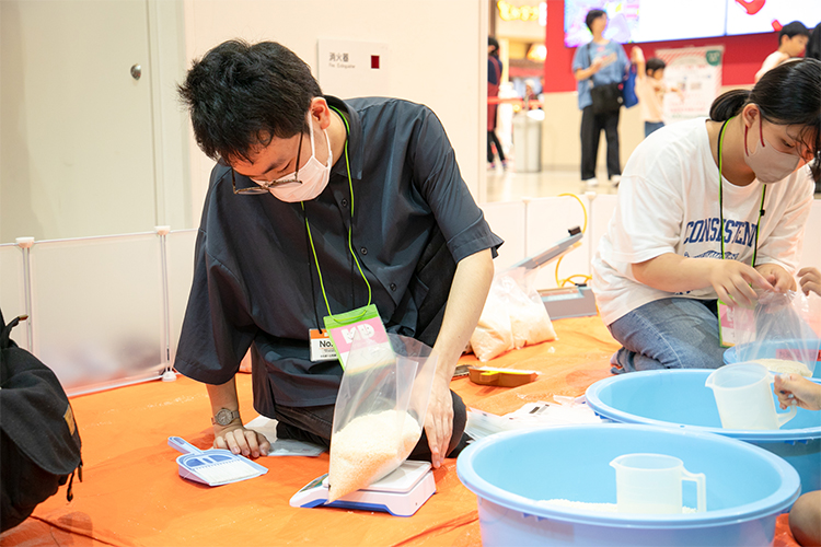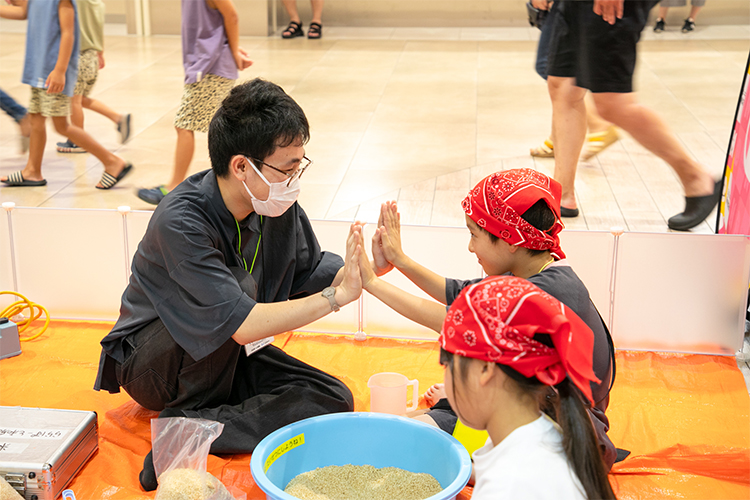 こどもたちのコーチ役として、安全に楽しくオシゴトに取り組めるようにサポートするのが、今回の役割。山口学園の長原さんは「米屋」のこどもサポーターを担当しました。「米屋」でこどもたちが取り組むのは、お米を1000gずつ袋に詰めていくオシゴト。長原さんは、身支度のフォローやデモンストレーション、お米の重さをはかるなど、サポーターの役割を丁寧に進めていきます。時にはこどもたちと一緒に考えたり、喜んだりしながら、働くこどもたちの成長を見守っていました。
