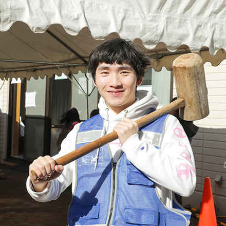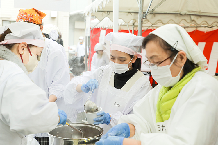 この日、地域の方々と一緒に餅つき大会を盛り上げたのは、山口学園の7名の学生。留学生たちは「日本の伝統文化が体験できる!」と気合十分!お餅をつく「つき手」を担当したほか、お餅を丸めたり、ぜんざいを作ったりと、いろいろな作業で地域の方々と協力して活動しました。一緒に作業をしていると、自然と会話も弾むもの。お餅の甘い香りが広がる会場で、学生たちは地域の方々との交流も全力で楽しんでいました。