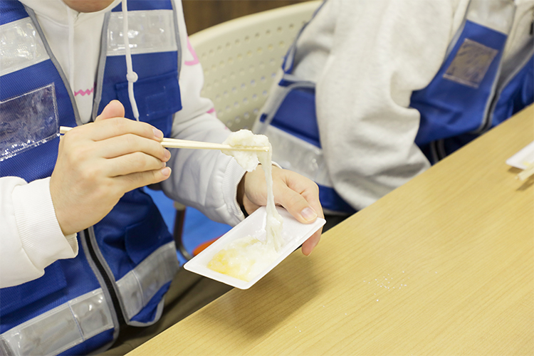 作業の合間には試食の時間もあり、学生たちはつきたてのお餅を堪能!写真は、運営スタッフ限定の大根おろし餅。