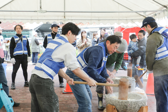 日本の年末といえば、お餅つき。大阪市北区の本庄地域では、毎年12月に「餅つき大会」が開催されています。今年も、昔ながらの「臼(うす)」と「杵(きね)」を使ってお餅をつき、地域の方々が一つひとつ丁寧に丸めて、来場者の皆さんに有料で販売されました。会場では「餅つき体験」も行われ、地域の子どもたちが日本の伝統文化を肌で感じる、にぎやかなひとときとなりました。