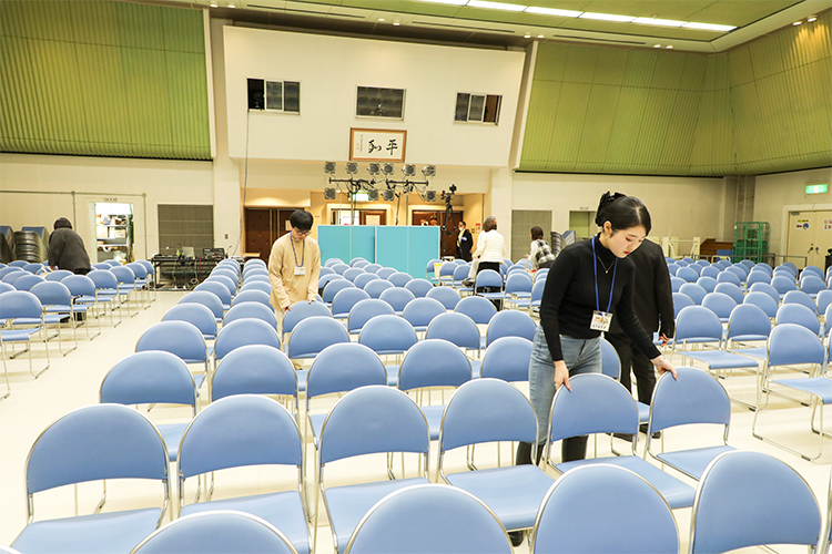 開場前には座席の最終整備。限られた時間の中でしたが、学生同士で連携しスピーディーに行います。