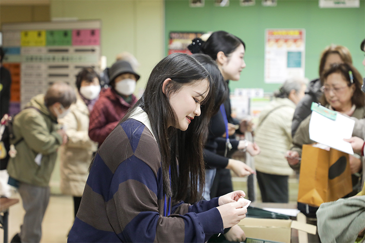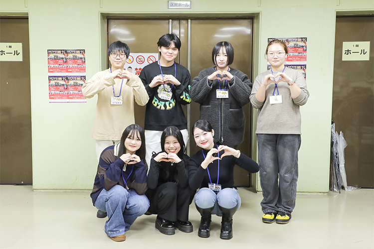 山口学園のボランティア学生たちは運営スタッフとして、パンフレットの準備と配布、鑑賞チケットの確認、入場整理などを行います。来場者の方々とコミュニケーションをとる場面も多く、臨機応変な対応が求められることも。また、2024年からは会場設営・撤収にも携わるようになり活動の場も広がっています。今回は留学生を含む7名がボランティアに参加しました。